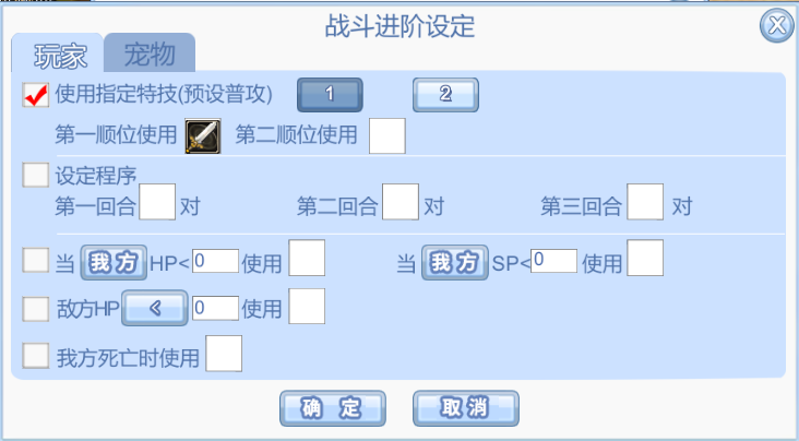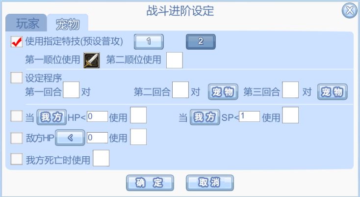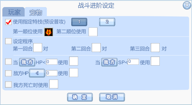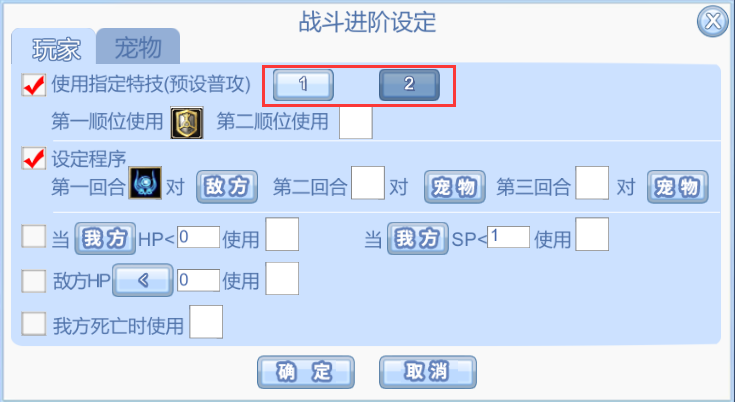 (2)进阶设定中,增加预设存储界面。玩家可以在不同的预设界面,存储不同的战斗设定。设置好后,针对当前想要使用的预设战斗设定,只需点击红框中1(2),点击确定后即可生效(宠物同理)。