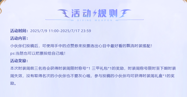 4.除不可抗力导致的活动无法开展,时装展或“神兵降临”时装周将在发放奖励后起每四个月举办一次,或期间其他活动会加入获得时装周装备渠道,详情关注官网后续活动公告内容