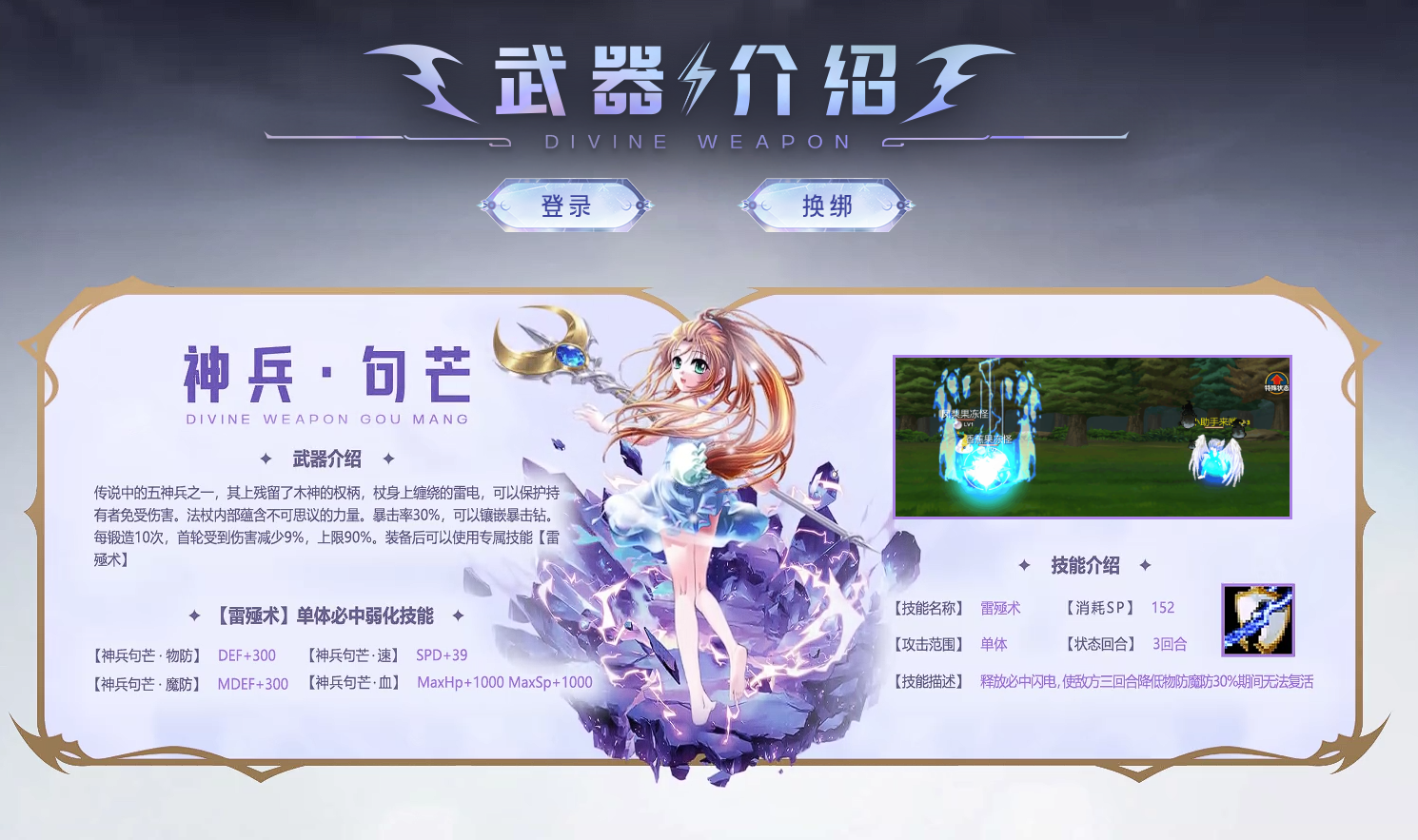 传说中的五神兵之一,其上残留了木神的权柄,杖身上缠绕的雷电,可以保护持有者免受伤害。法杖内部蕴含不可思议的力量。暴击率30%,可以镶嵌暴击钻。每锻造10次,首轮受到伤害减少9%,上限90%,仅PVE生效。装备后可以使用专属技能【雷殛术】