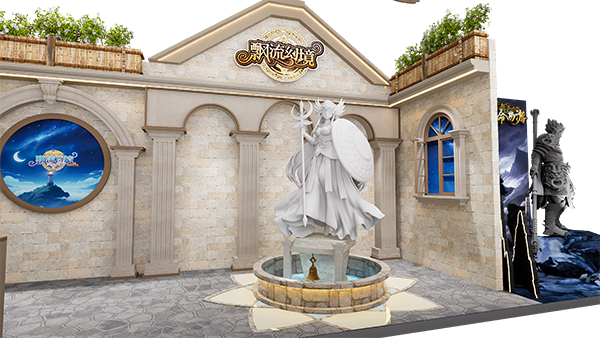 本次展台参考了游戏内喷泉场景设计进行搭建。通过展台的设计效果图,也以看到本次展台也将有请“雅典娜”等身雕塑“莅临现场”。来到现场的小伙伴们不要错过合照的机会呦!