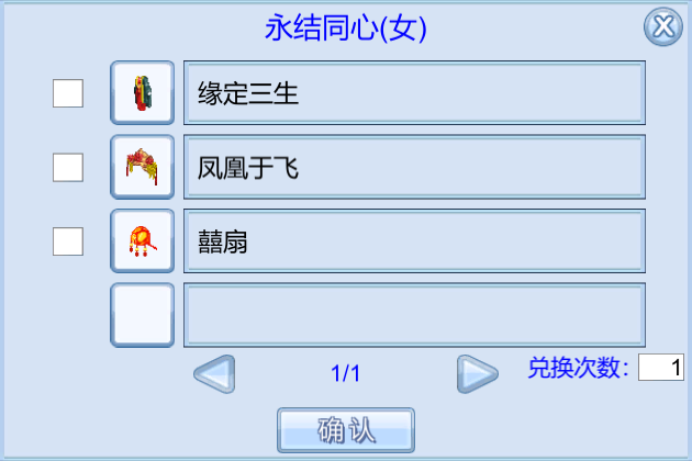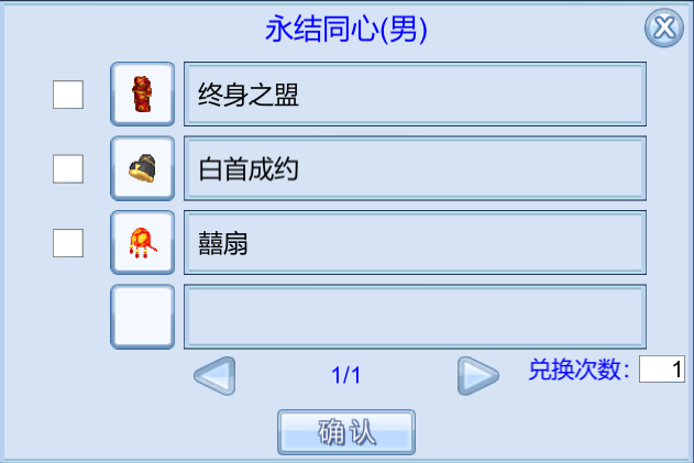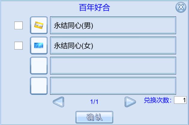 | 60000 | 百年好合*1(可交易)、星尘*15 | 使用后可自行选择永结同心(男)或永结同心(女) |