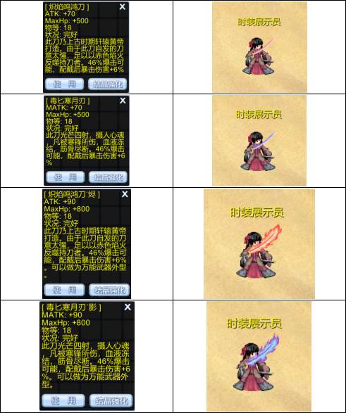 注:【炽焰鸣鸿刀˙烬】和【毒匕寒月刃˙影】将于下个客户端修改造型属性为【万能造型】