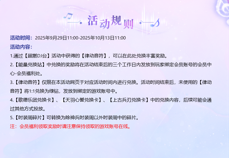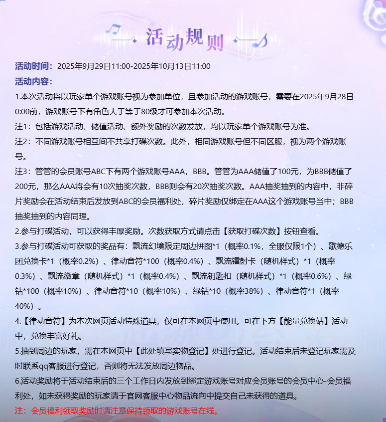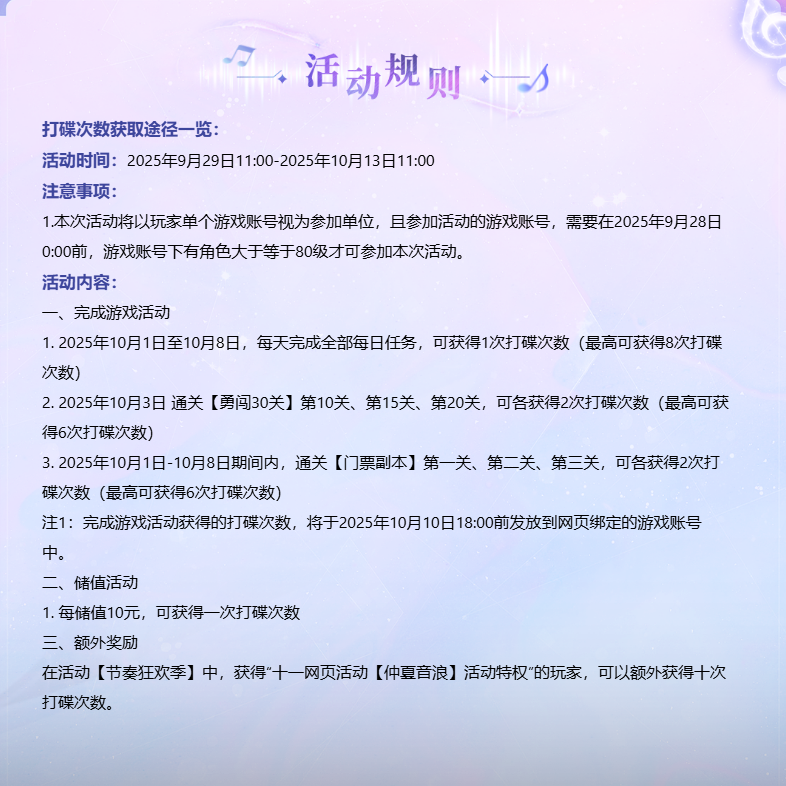 【仲夏音浪】国庆网页活动即将上线,本次网页活动将以玩家单个游戏账号作为参加单位,每个游戏账号参加活动更是可以获得最高20次的免费抽奖次数。接下来就让管管我为小伙伴们介绍一下吧!网页链接->【仲夏音浪活动网页】