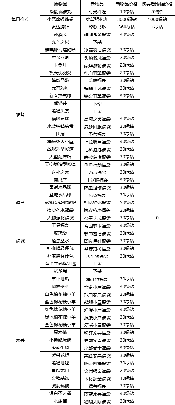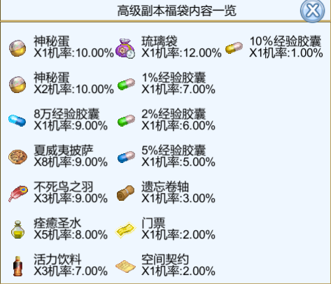 (1)【高级副本福袋】增加【空间契约】。福袋内【8万经验胶囊】【活力饮料】物品概率下调,详情如下