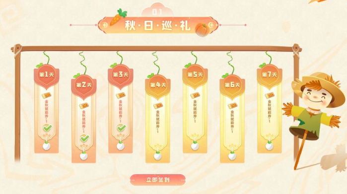 ①活动时间内,玩家每天可以在【秋日巡礼】中进行签到(共7天)。签到将获取本网页专属内容【金秋赋能券】。【金秋赋能券】获得后将被自动使用,可以让游戏账号绑定的【丰收里程】提高1级,并获取对应等级的奖励。