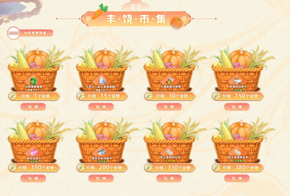 1.玩家在【丰收里程】中获得【金穗】时,可以在此处兑换奖励。