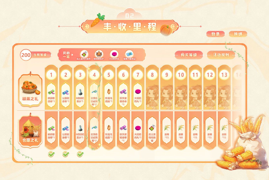 2.每日网页签到或进行储值,即可获得丰收里程等级并获得对应等级奖励。具体如下: