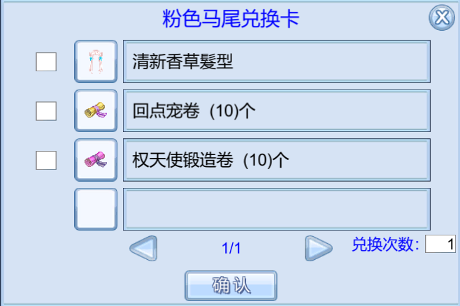 | 60000 | 粉色马尾兑换卡*1(可交易)、星尘*15 | 使用后可自行选择清新香草发型或其他优质物品 |