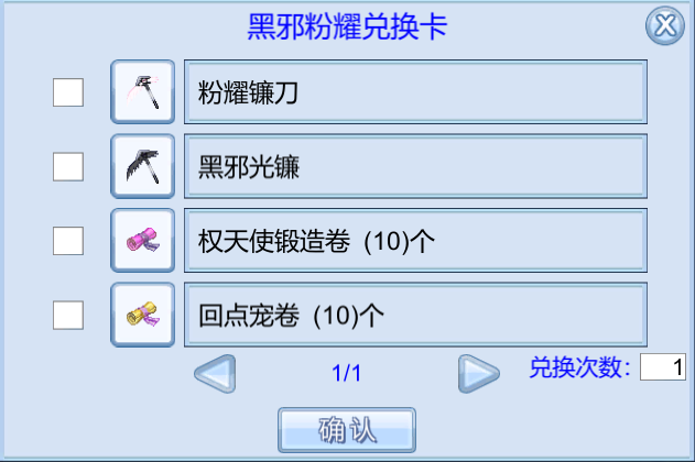 | 60000 | 黑邪粉耀兑换卡*1(可交易)、星尘*15 | 使用后可自行选择粉耀镰刀、黑邪镰刀或其他优质物品 |