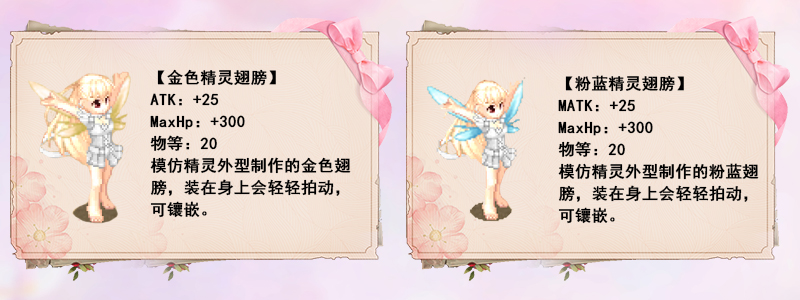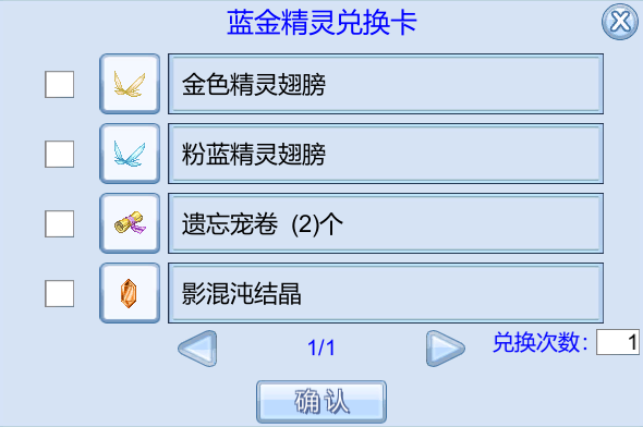 | 20000 | 蓝金精灵兑换卡*1(可交易)、星尘*12 | 使用后可自行选择金色精灵翅膀、粉蓝精灵翅膀或其他优质物品 |