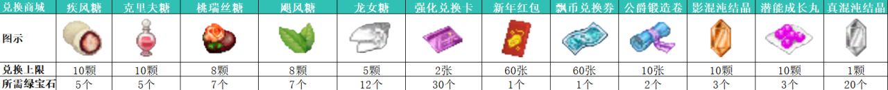 (1)每日通关副本并获得【绿宝石】,最快可在相应天数内兑换心仪道具(例如:真混沌结晶需20天积攒,龙女糖需60天)请合理安排您的挑战计划!