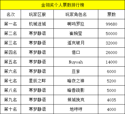 金翎奖个人投票排名结果出来啦!恭喜以下玩家获得本次金翎奖票数前10名,也再次感谢全部参与投票的小伙伴们对我们的支持!