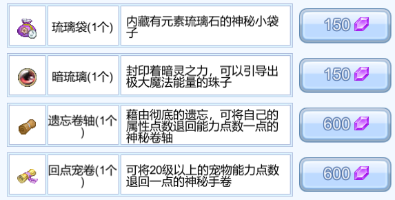 | 2000 | 回点宠卷*3,星砾*8 | 可将20级以上的宠物能力点数退回一点的神秘手卷 |