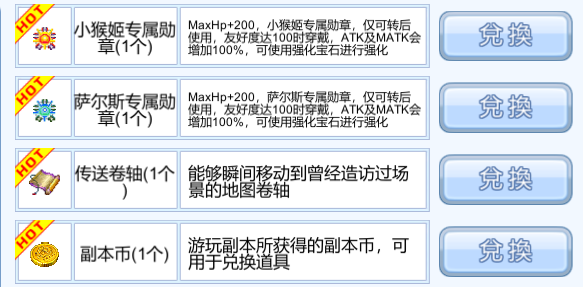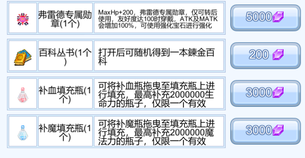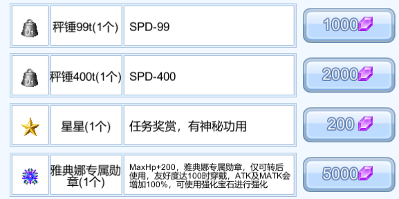 | 15000 | 南岛勇者兑换卡*1(可交易)、星砾*10 | 使用后可选择权天使锻造卷*5/影混沌结晶*7/新伙伴强化福袋*10 |