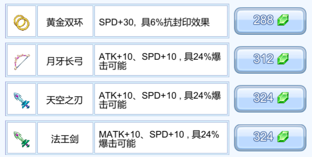![]() 凛冰双刃剑:SPD:+45 ATK:+45 46%爆击可能 |