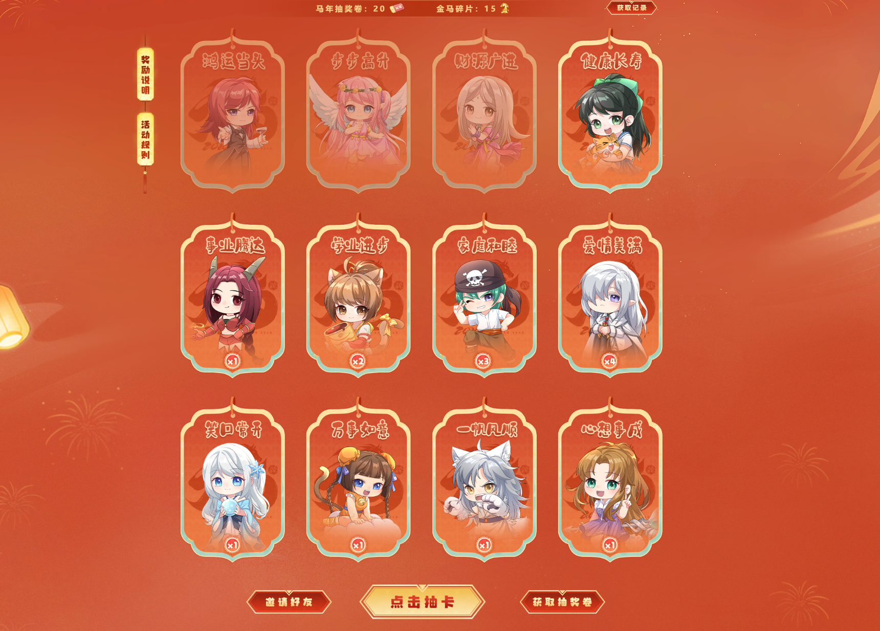 活动内容:收集马年福卡,集齐全部12张福卡即可获得稀有奖励,完成多轮收集更能获得额外超稀有奖励!