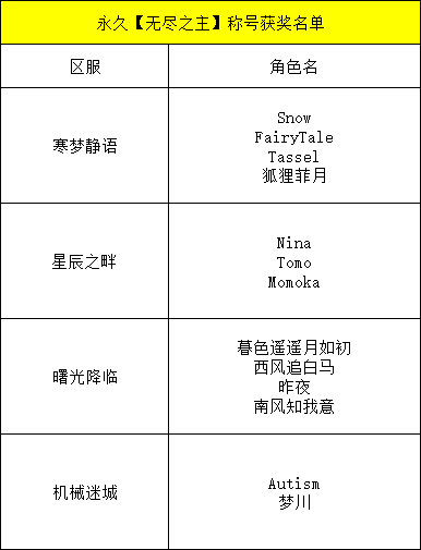 同时,恭喜以下玩家获得永久的【无尽之主】称号!