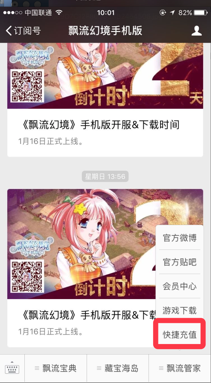 同时也可以通过关注官方微信订阅号,在底部菜单中找到“快捷充值”