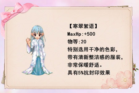 寒翠絮语福袋:强力补血轻便包24%、强力补魔轻便包24%、凤凰羽毛12%、痊愈圣水8%、琉璃袋3.7%、紫金宝箱钥匙10%、遗忘卷轴4%、5倍经验圣水5%、混沌结晶6.2%、影混沌结晶2.3%、寒翠絮语0.8%