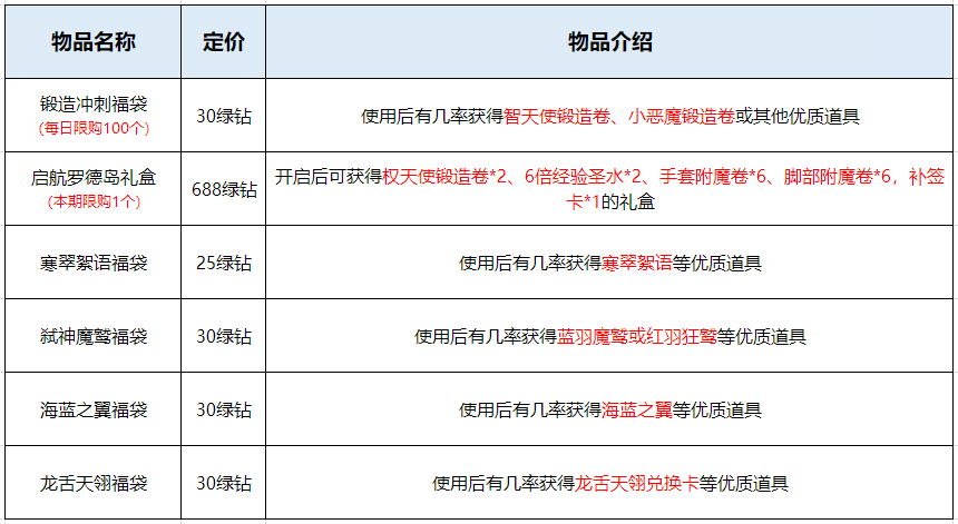 锻造冲刺福袋:强力补血轻便包23%、强力补魔轻便包23%、琉璃袋8%、潜能激发丸10%、紫金宝箱钥匙10%、5倍经验圣水7%、恶魔锻造卷轴7%、小恶魔锻造卷4%、权天使锻造卷4%、力天使锻造卷2.2%、座天使锻造卷1%、智天使锻造卷0.8%