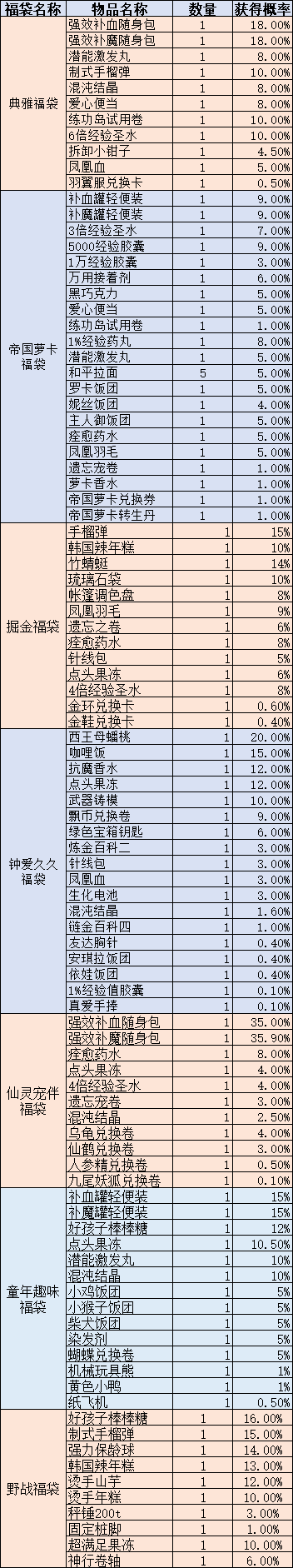 道具类:典雅福袋、掘金福袋、钟爱久久福袋、野战福袋、哥特风福袋、变装福袋限时8折