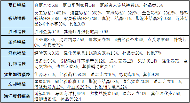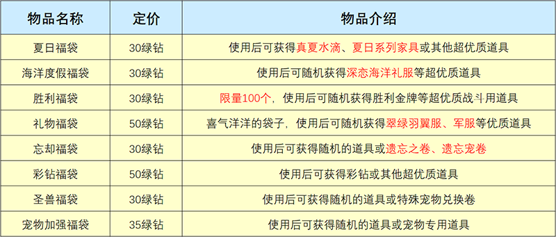 三叶虫福袋、惊奇宝箱、动物装扮福袋、天魔福袋、练功惊喜包、好康福袋