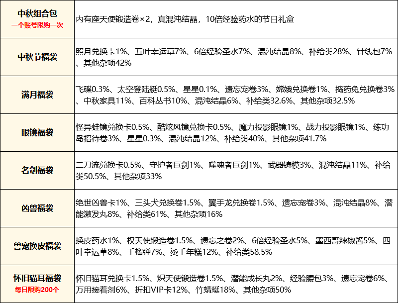 领取条件:活动期间连续开启150个中秋节福袋,未开到“照月兑换卡”,则可以提交信息领取“照月兑换卡”一个。