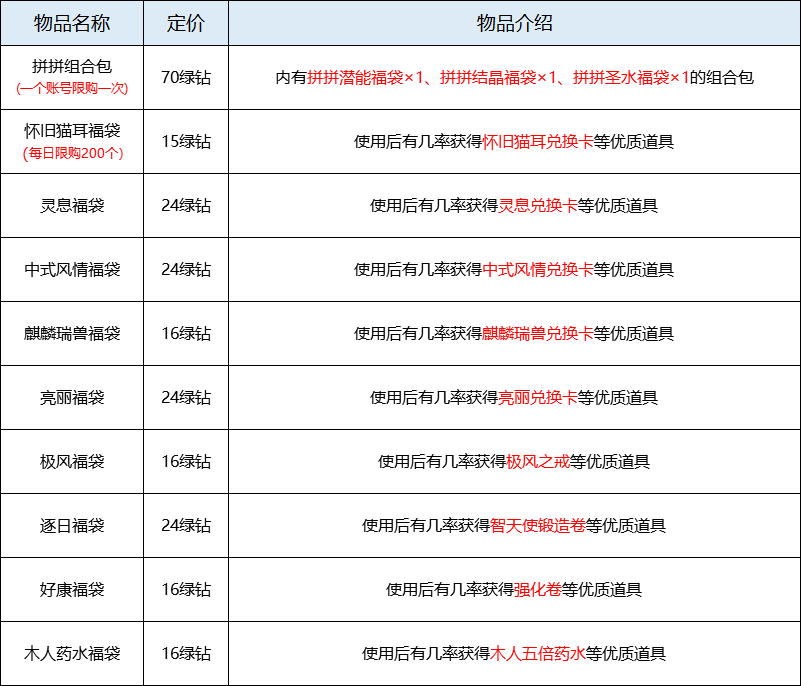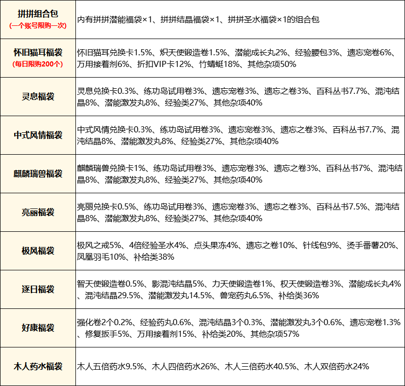 拼拼潜能福袋:2个潜能成长丸20%、1个潜能成长丸20%、2个潜能祝福丸20%、1个潜能祝福丸20%、5个潜能激发丸20%