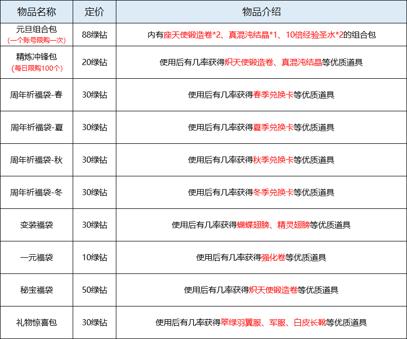 春季兑换卡:凤凰兑换卷、远古狂龙兑换卷、兽魔叉、灵魔叉、金质翼靴、白镰灵兑换卷、光明之翼、三头犬兑换卷、地狱炎魔兑换卷、男羽翼服、女羽翼服、樱花缎带