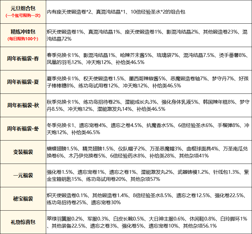圣叉福袋、霞雾星尘福袋、梦幻梦想福袋、圣诞麋鹿福袋、节日礼物福袋、逐日福袋、混沌乐园福袋、好康福袋、新伙伴强化福袋限量